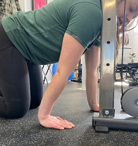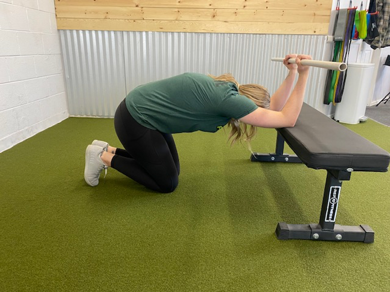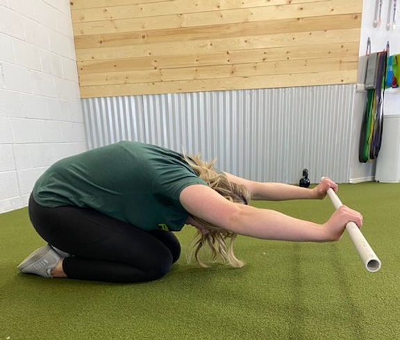 Shoulder mobility: As Dr. Zach Tallie discussed in our last blog post, one of the greatest limitations to overhead mobility is lat tightness. You can assess your lat muscle tightness by sitting with your back against the wall and raising a PVC pipe overhead until your knuckles touch the wall. If you are unable to touch your knuckles to the wall or cannot keep your back flat against the wall, you likely have tightness in your lats or upper back. To stretch these muscles, you can practice the prayer stretch in the picture below. Do this stretch for 30 seconds, 2 times per day for the best results.